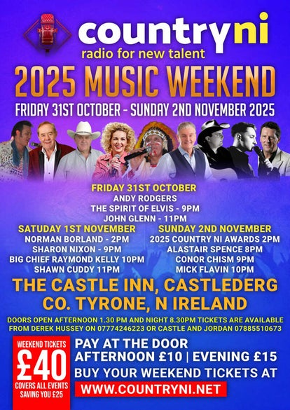 Artists joining us for this fantastic music weekend are John Glenn, Mick Flavin, Shawn Cuddy, Raymond Kelly (Big Chief Geronimo), Andy Rogers (The Spirit of Elvis) Sharon Nixon, Norman Borland, Alastair Spence, Conor Chism and Brian Kerrigan.